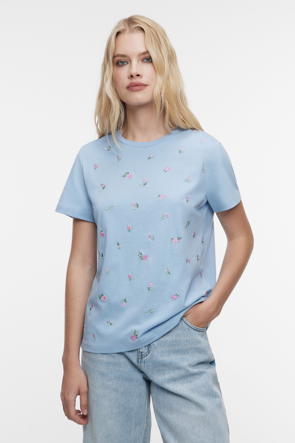Футболка прямая хлопковая с принтом-вышивкой 2331376457, цвет: голубой