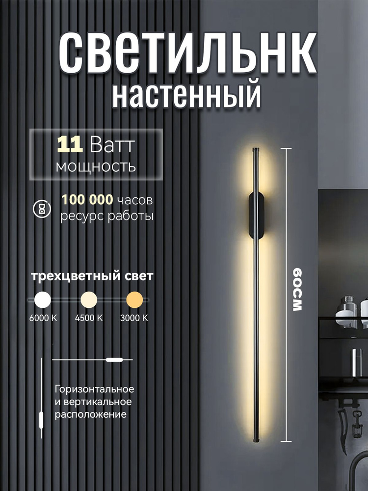 Светильник настенный светодиодный черный, 60 см,11W, три режима, Черный