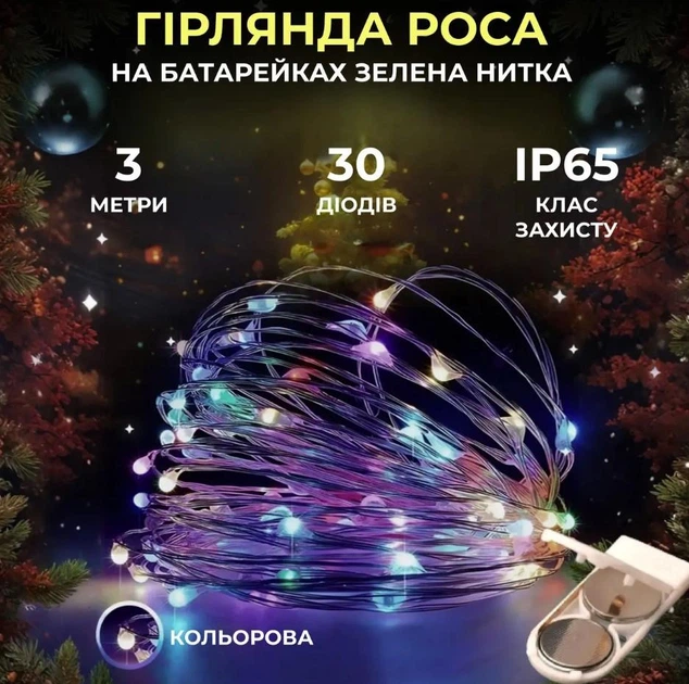 Светодиодная гирлянда Роса 3 метра на батарейках 30 led нить на зеленом