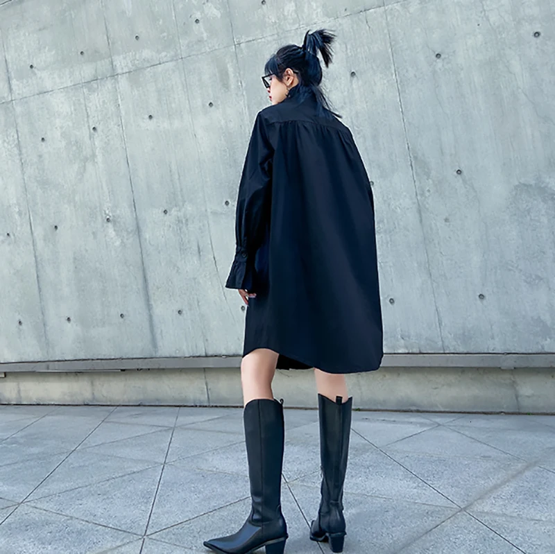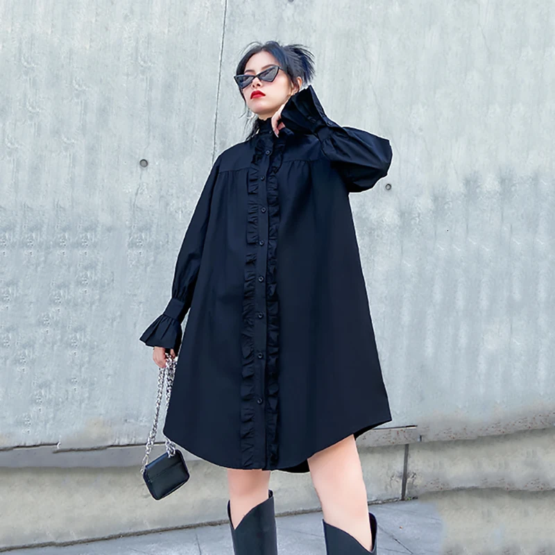 [EAM] Женская Черная длинная блузка с оборками большого размера, новая