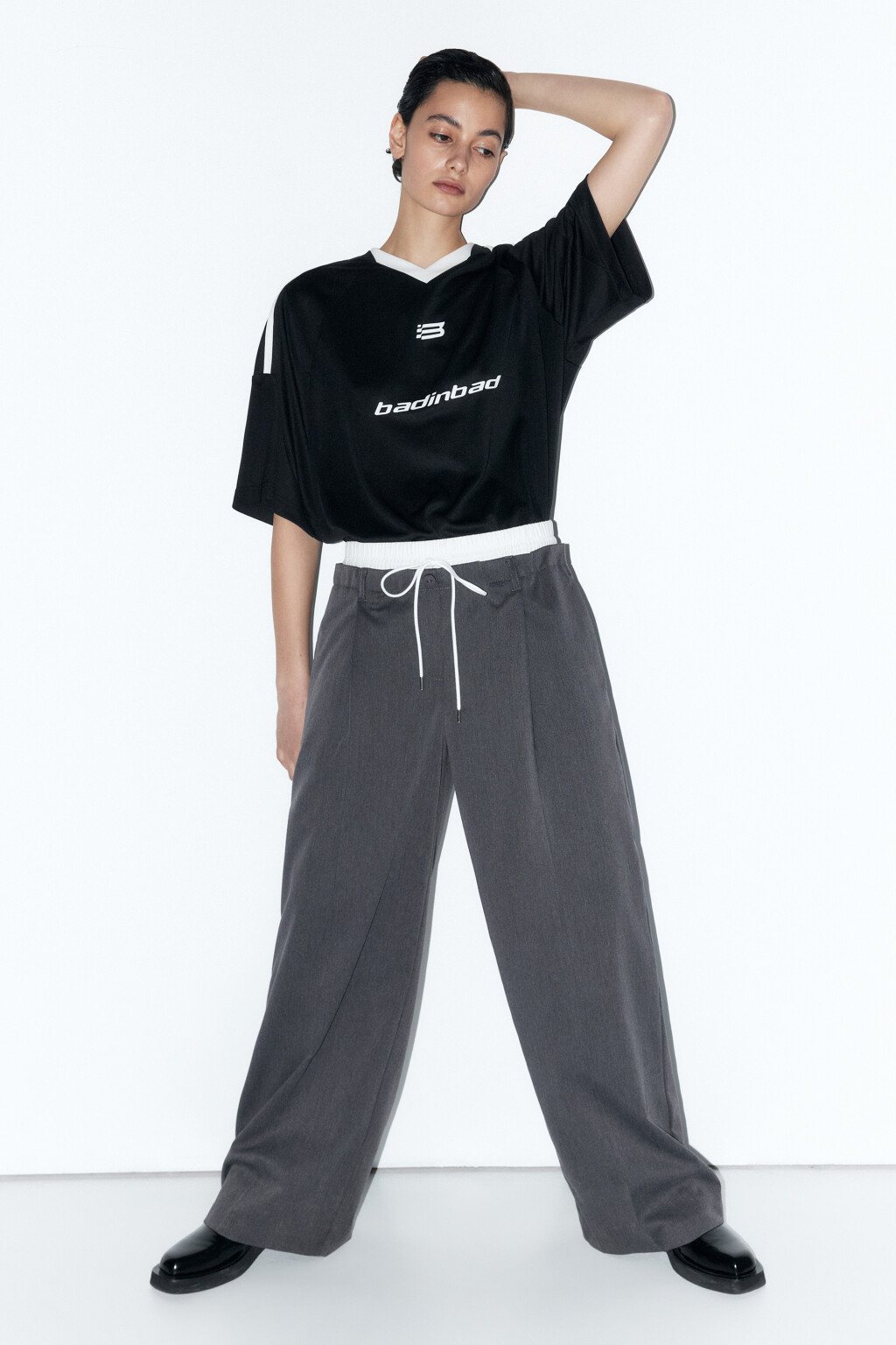 Комплект состоит из рубашки и брюк. В брючном комплекте с ярким