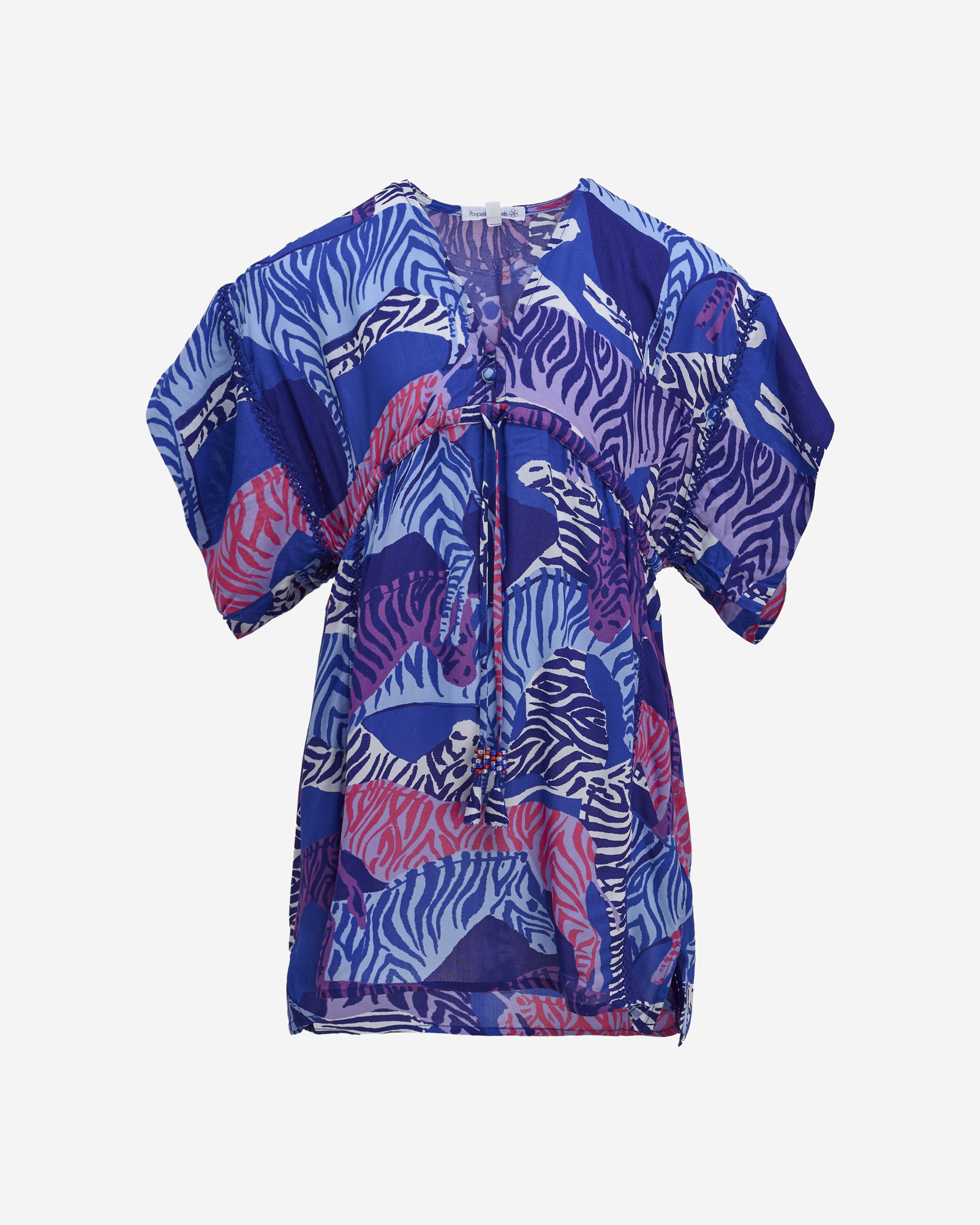 Платье свободного кроя с короткими рукавами и ярким принтом. V-образный