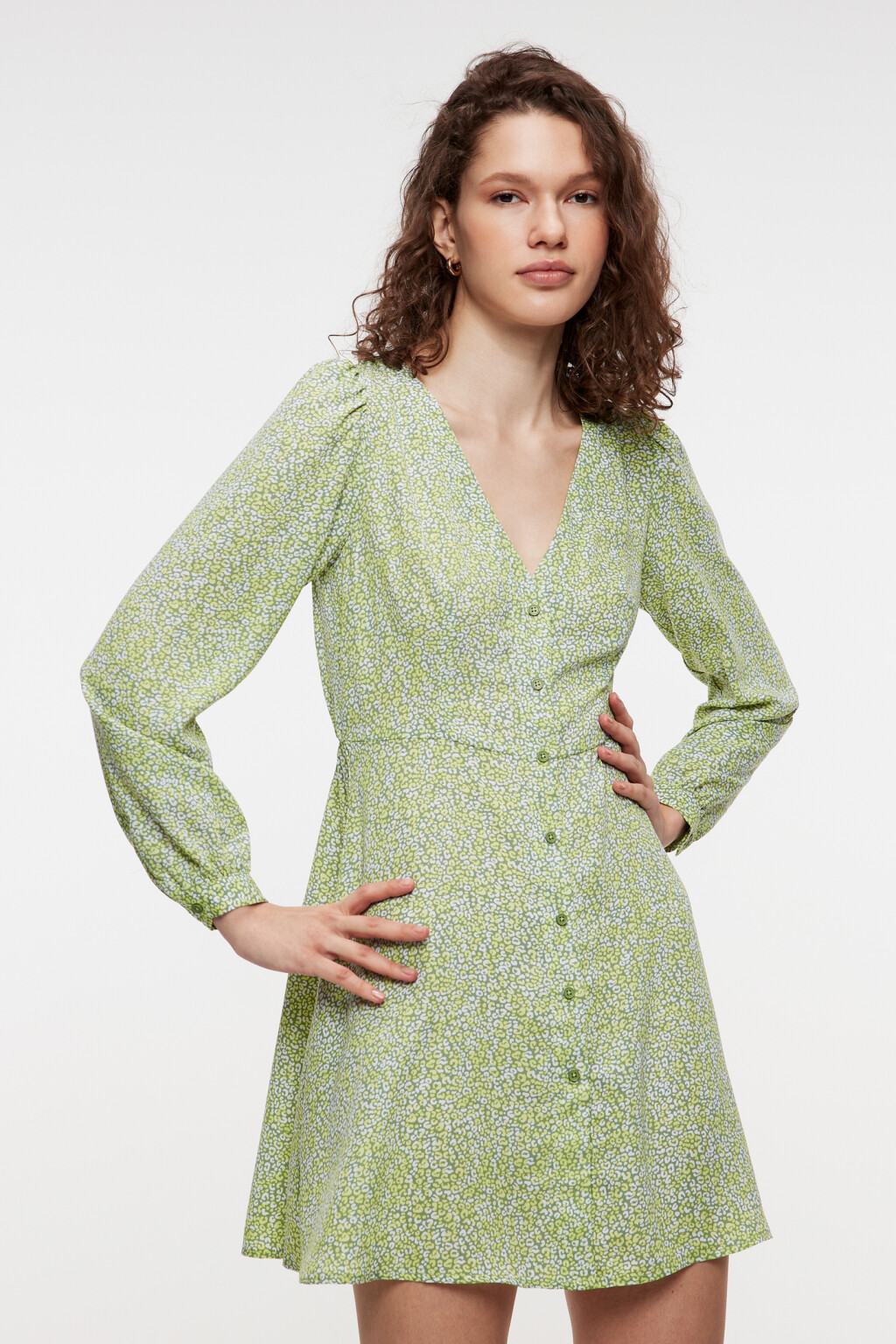 Платье мини с v-вырезом и цветочным принтом 2321484559, цвет: зеленый